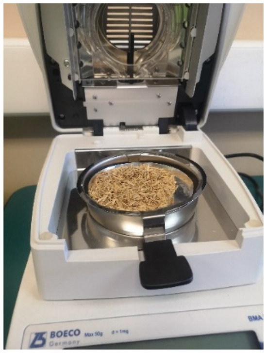 The moisture content was measured using the Boeco moisture analyzer, Hamburg, Germany, model BMA H50, as shown in Figure 2. This device operates with halogen light and functions within a temperature range of 10–40 °C, providing results with an accuracy of 0.001%. The measurement process using this analyzer is illustrated in [28].