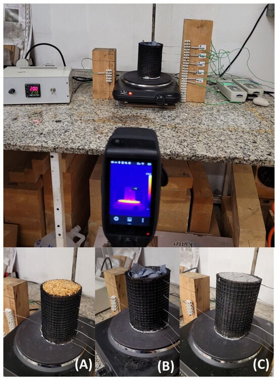 Smoldering setup and samples. (A) Rice husk, (B) recycled textiles, (C) cellulose.