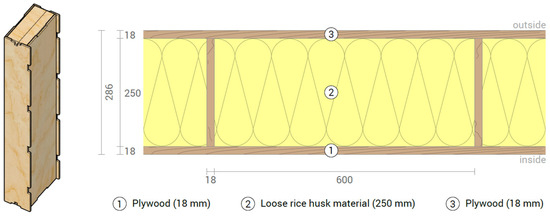 Rice is among the most widely cultivated crops globally, feeding nearly half of the world’s population [9]. Rice husk represents approximately 20% of global rice production, generating nearly 200 million tons of this agricultural waste annually. Additionally, the slow biodegradability of this residue poses significant environmental concerns, emphasizing the importance of valorizing this natural fiber [10]. Given these environmental challenges, recent research efforts have focused on developing innovative insulation materials derived from rice husk, with examples including insulation panels produced via the pulping method, exhibiting a thermal conductivity of 0.037 W/mK and 137 Kg/m3 [11], as well as composites combined with various binders to create panels exhibiting favorable thermal and properties in the range of 107–378 kg/m3 and 0.0045–0.108 W/mK [12,13,14,15,16,17,18]. Significant research has also been conducted on utilizing rice husk ash to improve certain concrete properties, where it has been used as a substitute for Portland cement. A hollow insulated block, where rice husk ash and rice husk insulation mixed with aluminous cement served as the binder, has been examined [19]. Rice husk is notably characterized by its high silica content compared to other agricultural residues [10]. The promising results observed in other studies advocate for further exploration of rice husk’s properties and its potential applications in energy-efficient construction [17]. Considering the potential of this agricultural residue, it is essential to investigate its integration into broader contexts, such as industrialized construction systems.