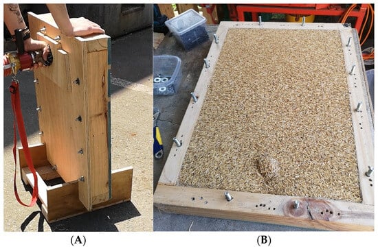 The rice husk was injected into the test panel by means of the blowing technique (Figure 6A) using an X-Floc M99-DS blowing machine X-Floc Dämmtechnik-Maschinen GmbH, Renningen, Germany. The correct application was achieved using the following configuration: 80% blowing power, corresponding to 352 m3/h, with an opening at the second level and the hopper operating at 80% capacity. It was necessary to maintain a consistent feed of the rice husk fiber to prevent blockages in the machine. Experimental testing confirmed that, under these conditions, the material could be efficiently blown without causing blockages in the hose or nozzle. This configuration allowed for uniform fiber distribution and density to be reliably achieved in each required application, contributing to consistently low thermal conductivity. Additionally, this method ensured that the thermal insulation material filled the entire empty space, as shown in Figure 6B. As demonstrated in the studies [28,30], this technique ensures a uniform distribution of fibers without the need for chemical additives, thereby reducing the material’s environmental impact. Additionally, the blowing method offers flexibility in application, making it suitable for both new construction and renovation work [30].