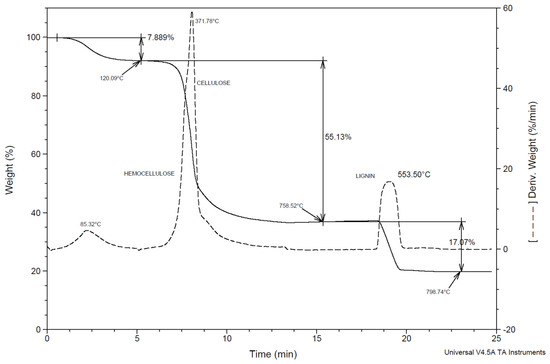 The proximal analysis carried out on rice husk in its natural state is detailed in Figure 7. According to the TGA, the fiber began to lose weight at 120 °C. This was observed, corresponding to 7.88% being mainly related to moisture, and subsequently, a more significant mass loss of 55.13% was observed between 120 °C and 759 °C, associated with the volatile compounds hemicellulose and cellulose. Once the environmental change to oxygen took place, carbon losses of 17.07% were observed between 758 and 798°, corresponding to lignin. Finally, the percentage of ashes was 19.92%, and this was displayed at 800 °C. The rice husk fiber presented stability until 120 °C, indicating that the temperature used for applying or processing should have been lower than this value to avoid thermal degradation. Similar results are shown for other natural fibers [30,32].