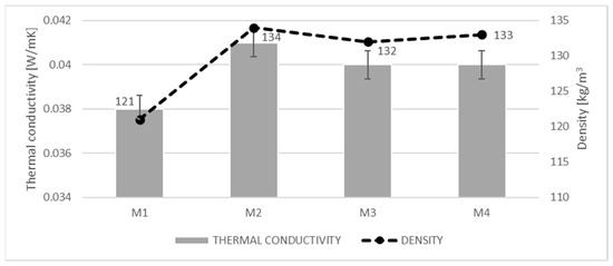 Figure 9 presents the measurement results, showing that the samples exhibit a thermal conductivity below 0.041, demonstrating their potential as a thermal insulation material. This value is comparable to conventional insulating materials, reinforcing their suitability for energy-efficient construction applications [53]. Unlike traditional insulation materials, where a higher density reduces thermal conductivity, lignocellulosic fibers show the opposite trend, with conductivity increasing as density rises [28]. This highlights the importance of optimizing density to maintain insulation efficiency properties.