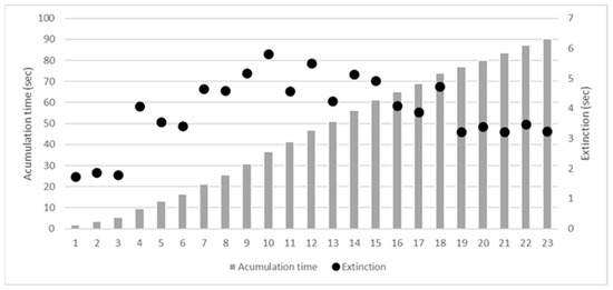 Figure 11 shows the flame extinction time, for a total of 23 applications, reaching a total of 90.34 s., which nearly doubles the number of tests reported in previous research on wood dust [29]. The average of all the extinguishing times is 3.93, with the first ignition time being 3.93 s. A significant observation was made at the 9 s mark, when a carbonized protective layer (Figure 12) began to form on the surface of the sample. This layer acted as a thermal barrier, preventing further combustion and allowing the material to endure 23 flame applications without complete degradation. This behavior aligned with previous TGA findings, where the initial moisture release was followed by the decomposition of cellulose and hemicellulose, leading to the formation of a char layer that enhanced fire resistance.