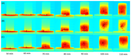 For this smoldering test, the reactor was filled with samples of (A) rice husk fiber, (B) recycled textile, and (C) cellulose, which were evaluated. During the experiments, the evolution of smoldering was visualized with an infrared camera. Figure 13 shows the results: The images are presented in a sequence of seven pictures every 10 min from 50 min to 110 min. The red color corresponds to temperatures around 240–261 °C. In samples (A) and (B), the evident smoldering begins at 65 min, while with cellulose, it starts at 55min.