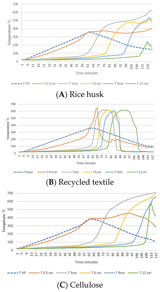 Smoldering process thermographies. (A) Rice husk, (B) recycled textile, and (C) cellulose.