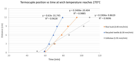 Smoldering is a phenomenon of combustion without flame, which is especially crucial in combustible porous materials. During the experiments, the hot plate was heated for one hour until it reached a predetermined temperature of 360 °C, after which it was left to cool down to room temperature for another hour. The process was monitored using an infrared camera, capturing images every 5 min [39,40]. The smoldering velocity was calculated by analyzing the temperature data recorded by the thermocouples, specifically by identifying the time it took for each thermocouple position to reach a temperature of 270 °C. In order to perform the experiment, rice husk, recycled textiles, and cellulose were selected to compare their fire behavior. As shown in Figure 3, these materials exhibit similar thermal insulation properties: cellulose ranges between 0.035 and 0.040 W/mK [41], and recycled textiles are in the range of 0.33 to 0.39 [42], making them suitable reference materials for evaluating rice husk fiber’s insulation performance. Additionally, due to their physical characteristics, these materials are also suitable for application via the blowing technique within modular construction systems.