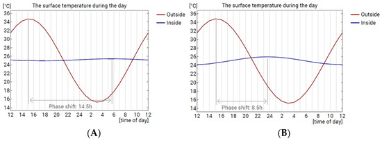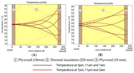 Figure 17 shows the temperature behavior when recycled PUR insulation materials are replaced with rice husk fiber. A notable reduction in temperature fluctuation amplitude occurs, demonstrating its effectiveness in mitigating the impact of external temperature peaks. Such thermal performance improvements are typically not observed with conventional insulation materials like recycled polyurethane, which tend to closely follow external temperature fluctuations [29].