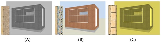 Different scenarios simulated. (A) Rice husk fiber, (B) recycled PUR, (C) non-insulated.