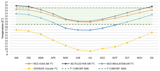 Annual indoor temperature profiles for rice husk, recycled PUR, and no insulation scenarios.