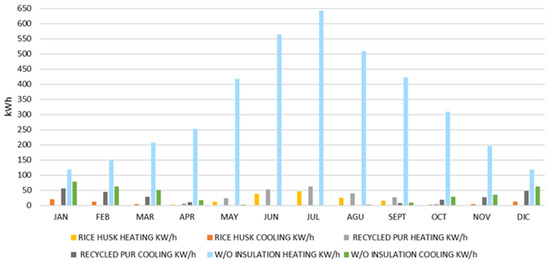 The results presented in Figure 20 illustrate the energy consumption in kWh required for heating and cooling the modular unit under different insulation scenarios. The data clearly indicate that the rice husk fiber exhibits the lowest energy consumption, outperforming both recycled PUR and the non-insulated case. The non-insulated scenario shows significantly higher energy demand, particularly during the winter months, where heating consumption peaks at well above 643 kWh. This highlights the inefficiency of an uninsulated module at maintaining indoor thermal stability, requiring excessive energy to compensate for heat loss. The rice husk fiber demonstrates the highest energy efficiency. In Table 4, the annual consumption and the rice husk scenario that maintains lower heating and cooling demand compared to the other two scenarios is shown, with 9.56 kWh/m2-year of heating demand, which is close to the 11.70 kWh/m2-year reported by [25] in a similar construction using wheat straw insulation. The heating energy demand observed using rice husk fibers is significantly lower compared to other thermally improved dwellings in Temuco, with a range between 40 and 80 kWh/m2-year [26]. This represents an approximate reduction of 81%, underscoring rice husk fiber’s substantial potential for enhancing energy efficiency in buildings.