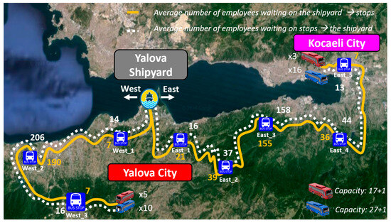 At the Yalova Shipyard, a network of shared shuttle buses, which is financed by the shipyard companies, is used to transport employees between home and work. The shipyard’s passenger shuttle service consists of a total of 34 vehicles of two types with different capacities (17 + 1 and 27 + 1 seats). The shuttle buses operate in two different directions in the cities of Yalova and Kocaeli. There are a total of eight bus stops in these two main directions, three in the west and five in the east, as shown in Figure 2. The meeting points (bus stops) and service routes were usually determined depending on the location of the regions where employees live. Intermodal transfer opportunity was also considered during the meeting points determination process.