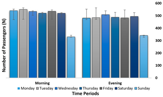 Within the shuttle service, the number of employees to be picked up or dropped off at stops for home–work–home trips may vary for reasons such as shift changes, additional labor requirements due to work intensity, employees working overtime and employees being directed to other units when needed. For this reason, the analysis of the data shows that the number of services and trips required in the transport network varies from day to day. As this change cannot be foreseen in the current active shuttle system, the provision of all shuttles owned by the company leads to inefficient capacity management. According to the information obtained from the available data, the change in the number of passengers at the stops for a sample period of one week is shown in Figure 4.