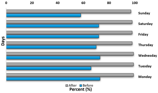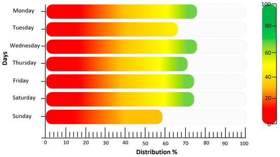 Analysis of the data shows that the capacity of the shuttles used to transport employees to and from work is not being used effectively [63,64]. The random distribution of employees from the shipyard stop to the shuttles results in some shuttles being full and passengers having to stand, while other shuttles run with a number of passengers below capacity. For this reason, in the designed transport network, the services that are put into service without numerical service planning are reflected as additional costs. When analyzing the data obtained from the existing system, the occupancy rates of the shuttles, calculated by taking into account the total capacity of the shuttles used for morning and evening transport during the week, are as shown in Figure 5.