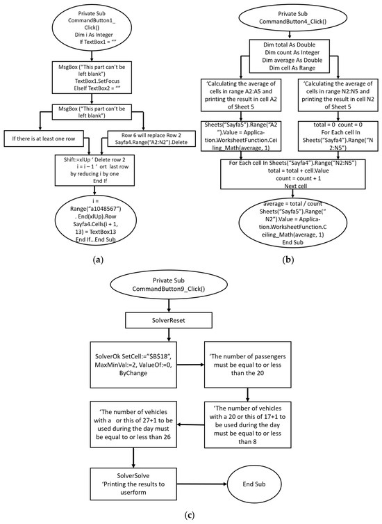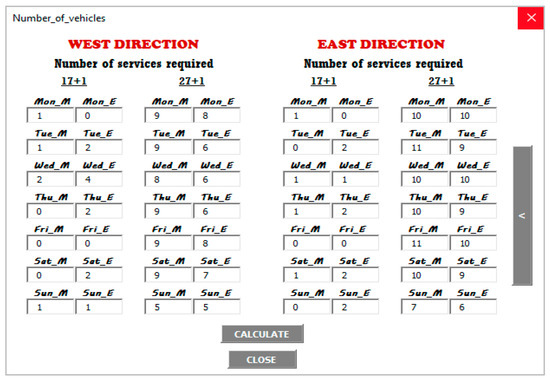 Since the models created in optimization problems contain a large number of variables and equations, their solution creates complexity. For this reason, many software programs have been developed to facilitate solution [68,70]. In this study, an interface was developed by using Microsoft® VBA 16.0 and solver plug-ins together. In this way, the constraint values are obtained for the dynamic linear programming problem (DLPP) model by recording the number of employees who use the shuttle service provided by the company each day and taking into account the number of passengers over the last four weeks using the moving average method. The next step is to determine the number of vehicles required to minimize fuel costs according to the constraint values updated each week.