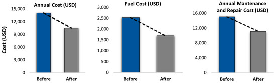 The maximum number of vehicles to be accommodated in the company was determined by taking into account the maximum number of vehicles needed in the east and west directions in the same period of time—in other words, the maximum number of vehicles operating simultaneously. When analyzing Figure 9, this value for the 17 + 1 capacity vehicle gives the maximum number of 17 + 1 capacity vehicles that should be accommodated within the facility as four westbound vehicles and one eastbound vehicle on Wednesday evening when the maximum demand is at its peak. The maximum number of 27 + 1 capacity vehicles required is determined as a total of twenty vehicles, nine westbound on Tuesday morning and eleven eastbound at the same time. In this case, nine of the thirty-four vehicles allocated to the service network are wasted. This represents a gain of approximately 27% for this case study. Based on the results of the analysis, the value of the objective function as a result of the optimization was found to be USD 1695. This shows that the existing service achieves a 33.9% reduction in fuel costs (Figure 10).