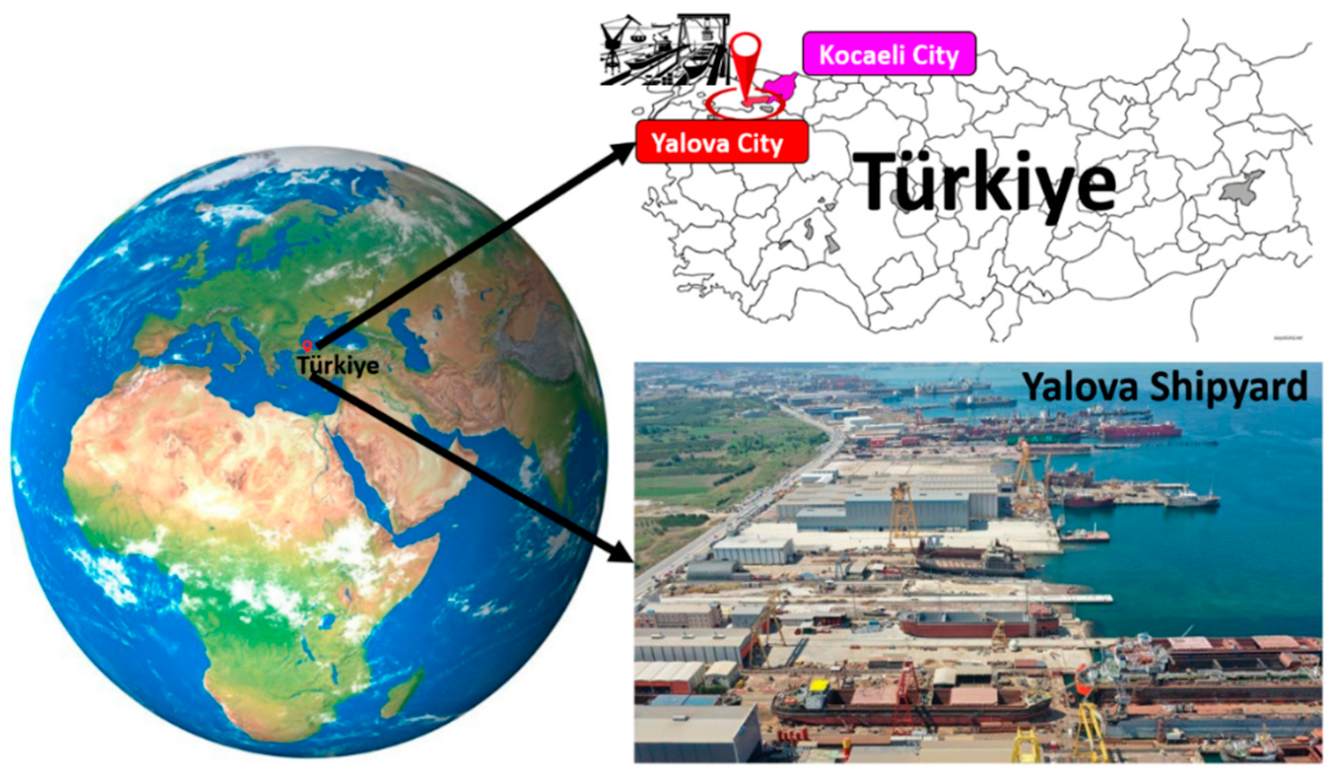 The study was carried out at the Yalova Shipyard in Türkiye, which is one of the most important ship repair yards in the world and Europe. The Yalova Shipyard, nestled in the strategic heart of Türkiye’s Marmara region, is a symbol of maritime excellence and innovative craftsmanship. With a rich legacy rooted in Türkiye’s longstanding naval tradition, the shipyard has evolved into a modern hub for both shipbuilding and repair, catering to a diverse range of vessels from agile coastal boats to robust commercial ships. The Yalova Shipyard has been serving the world’s leading foreign ship owners and ship management companies based in Greece, Italy, Germany, Denmark, Hong Kong, Singapore and Japan since its establishment. The shipyard has 700 m of seafront, 2.5 km of ship repair docks and a shipyard area of 216,000 m2 located in the Altınova region of Yalova city. The location and visual appearance of the yard are shown in Figure 1.