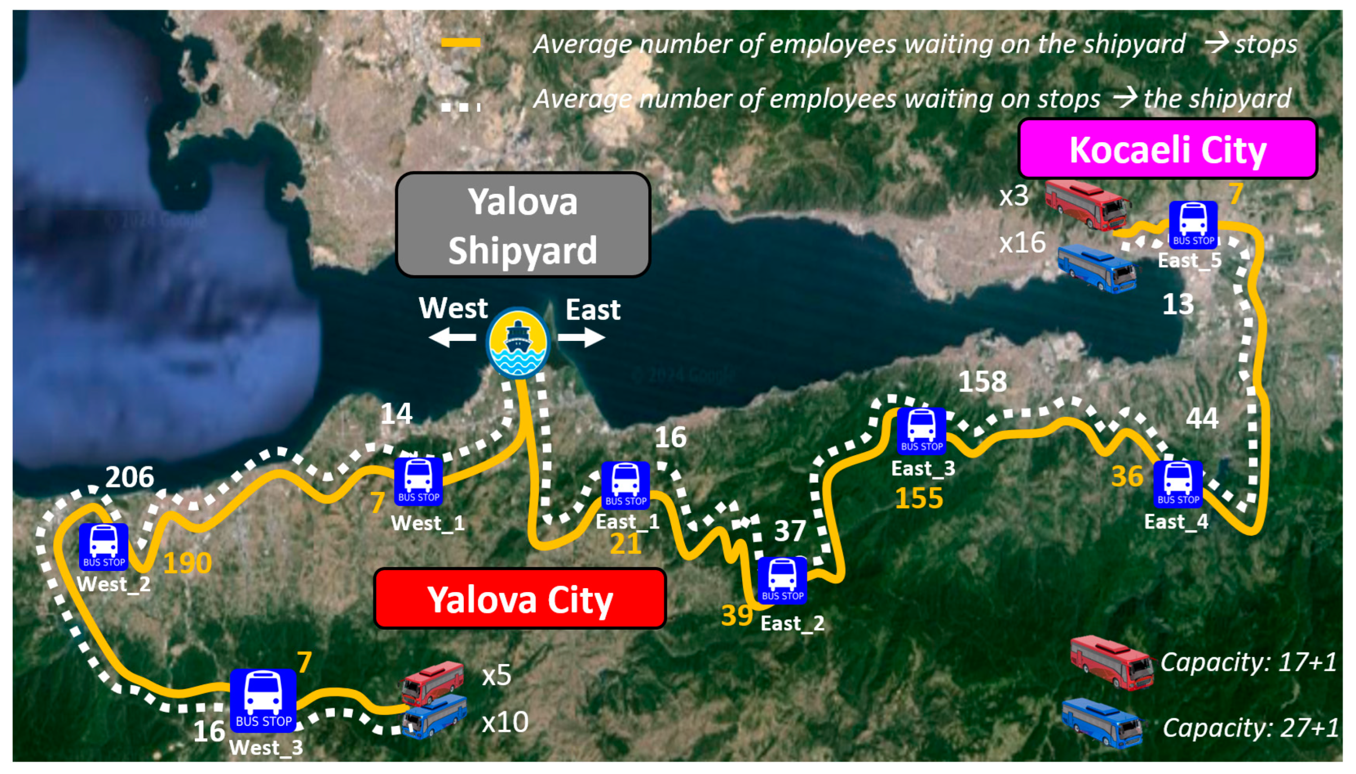 A shuttle service is provided to the shipyard in the morning and at the end of the shift in the evening between Yalova city and Kocaeli city. The total length of Route 1 from the center of Yalova city to the entrance of Yalova Shipyard (west direction) is 50 km. The total duration of Route 1 (west direction) is on average 45 min (varies depending on morning and evening traffic density). The total length of Route 2 from the center of Kocaeli city to the entrance of Yalova Shipyard (east direction) is 56 km. The total duration of Route 2 (west direction) is on average 50 min (varies depending on morning and evening traffic density). The departure schedule from the two ends (to the shipyard) is 7:00 am, and the departure from the shipyard to the centers of the two cities (east and west) is 17:00 pm; the arrival of each employee at the Yalova Shipyard meeting point is 8:00 am, and the arrival of each employee at the meeting points in the city centers is around 18:00 pm. In case of additional shifts in the evening, additional shuttle services are provided. Employees wishing to use the shuttle service should wait at the designated bus stops and use the cards issued by the company for employees using the shuttle service when boarding. This digitally records, on a daily basis, how many employees take the respective shuttle service from the respective stop. The demand for shuttle services can fluctuate for reasons such as overtime, transfers between units and the need for additional labor. These fluctuations in demand can lead to situations where the services available, i.e., the existing capacity, are not used effectively. This unfavorable situation causes the company to maintain surplus shuttle buses, which creates unnecessary costs. Therefore, in order to minimize the cost of using shuttle services, the company needs regular and dynamic modeling to regulate the number and frequency of shuttle services.