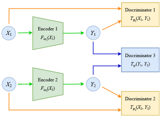 In Figure 2, we employ two deep neural networks (DNNs) as encoder networks, denoted as and , respectively. Discriminator networks and are trained to estimate mutual information and , respectively. Similarly, discriminator network along with the parameter are optimized to estimate Chernoff information . Therefore, for given distortion constraint D and weight coefficient , the encoders can be optimized according to the following objectives