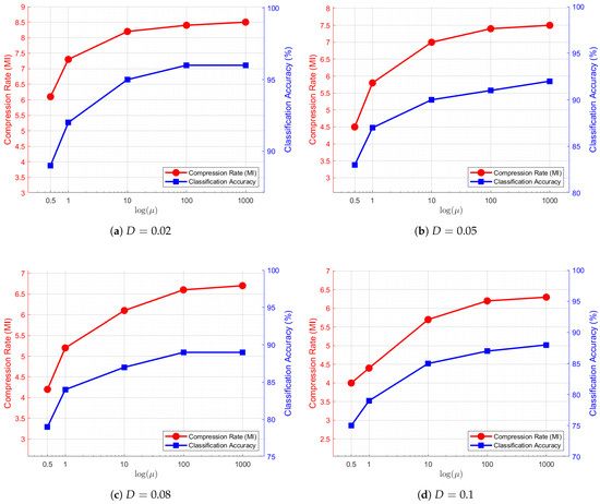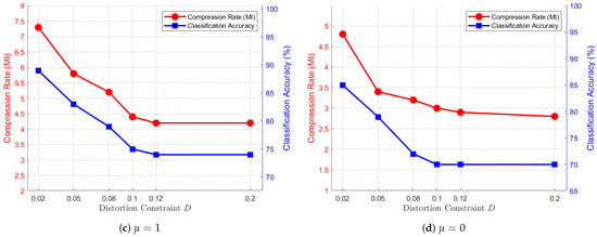 Similarly, we fix and examine the relationships between compression rate and distortion constraint D, as well as classification accuracy and D. The corresponding curves are depicted in Figure 6. A general trend observed across these subfigures is that when , both the compression rate and classification accuracy exhibit a decreasing pattern as D increases. This trend suggests that increasing D allows for more efficient compression; however, it also leads to severer loss of task-critical information, ultimately degrading classification performance.