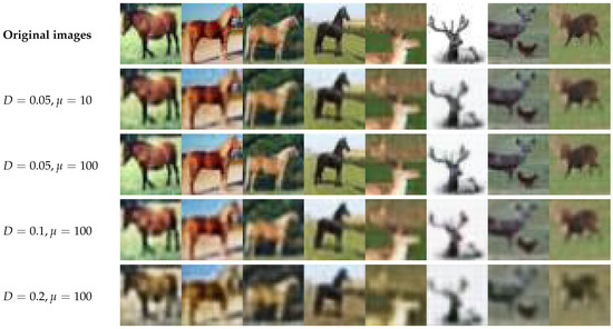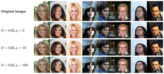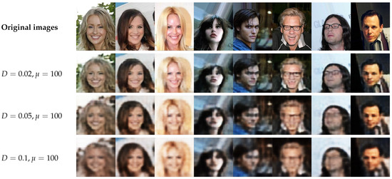 As shown in Figure 8a, when the distortion constraint is fixed at , increasing the weight coefficient leads to improvements in both compression rate and classification accuracy, until the performance reaches a saturation point. This trend corresponds well with the visualization results in the first three rows of Figure 9, where larger values result in more prominent class-discriminative features. On the other hand, when the weight coefficient is fixed at , as illustrated in Figure 8b, increasing D results in a gradual decline in both compression rate and classification accuracy, eventually stabilizing at a lower level. This effect is visually reflected in the last three rows of Figure 9, where higher distortion levels lead to progressively blurred image reconstructions. These two trends are consistent with the experimental findings on the CelebA dataset, confirming that the DVSC-Opt model consistently handles the trade-off between compression rate and binary classification performance across different datasets.