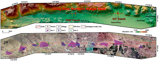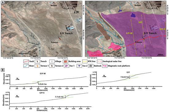 High-resolution satellite image of the trench in Erjiayan Village (image data from Google Earth (accessed on 2 August 2023)) and its geomorphological units (A). Topography profiles (EJY–E, EJY, and EJY–W) of fault scarps are set along the EJY trench (B).