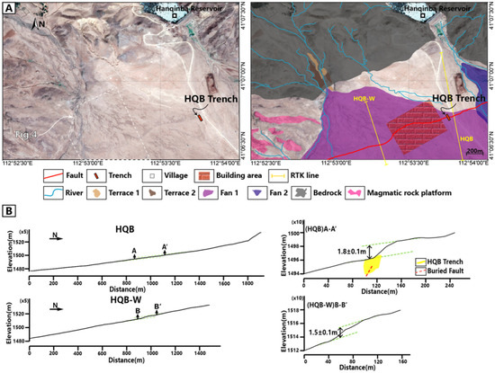 High-resolution satellite image of the trench in Hanqingba Village (image data from Google Earth (accessed on 2 August 2023)) and its geomorphological units (A). Topography profiles (HQB and HQB-W) of fault scarps are set along the HQB trench (B).