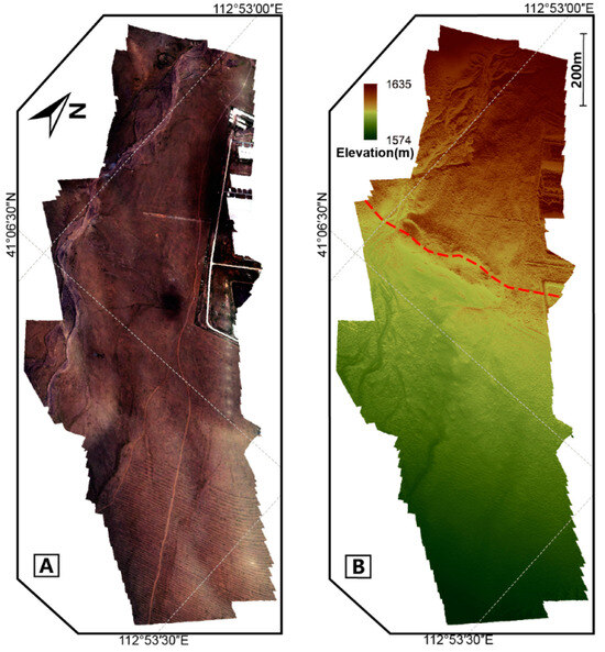 Due to restrictions from the no-fly zone around Jining Airport, the UAV-based mapping was limited in coverage at the study site. To more accurately define the height of the escarpment, a Trimble R8 Global Navigation Satellite System (GNSS) real-time kinematic (RTK) system was used for vertical measurements of the fault scarp. As vegetation is scarce in the Jining region, the flat, treeless terrain offered an ideal environment for a global positioning system (GPS), allowing for a baseline survey across a 2 km area to be internally accurate within 2 cm. The precise accuracy would be contingent upon the satellite geometry’s details at the time of the survey [34]. The Surfer 20 software (Version 20.1.195 (64 bit)) was used to produce the topography profile across the fault.