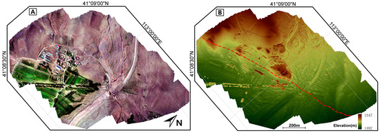 Advanced 3D surface reconstruction methods, including Structure-from-Motion (SfM) [32,33], were utilized to create high-resolution digital elevation models (DEMs) for each trenching site, leveraging an unmanned aerial vehicle (UAV). A DJI Phantom 4 RTK UAV (Shenzhen, China) was deployed to navigate a predetermined path within a rectangular zone at an elevation of 200 m. More than 300 high-resolution photographs, each boasting 20 million pixels and featuring a 75–80% overlap, were taken to facilitate the reconstruction of the terrain with a precision of 0.5 m. The integration of the Real-Time Kinematic (RTK) module into the UAV significantly enhances the absolute accuracy of image metadata, allowing for precise data collection without ground control points (GCPs). RTK technology minimizes the time delay between positional information and camera data, resulting in improved positioning accuracy for the captured images. This advancement ensures high precision in aerial imaging applications (https://enterprise.dji.com/cn/phantom-4-rtk, accessed on 7 April 2025). In this study, the Agisoft Metashape Professional software (Version 1.5.2 build 7838 (64 bit)) was used to produce the DEM data for the study area. The location of the fault scarp is determined by DEM.