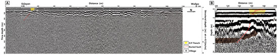 At the same time, ground-penetrating radar (GPR) can provide a clear image of the deformational structures, such as shallow subsurface fractures in different geological environments [38]. Since one of the trenches failed to reveal the fault, we deployed a GPR line parallel to the trench orientation to conduct a more representative and comprehensive study of the fault’s near-surface structure and spatial variations. A MALA RAMAC/GPR (Malå, Sweden) was deployed to collect data, and the Reflexw 01 software (Version v5.0 1CD) was used to produce the GPR profile.