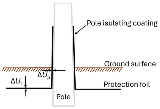 In the presented work, the focus is on protection with protective foil, used in the case of large Ut and Us values. A case is considered where the transmission pole is made of concrete. To protect against touch voltage, the pole must be coated with a suitable insulation material or surrounded with insulating material to a height to which an adult human does not reach and to the depth at which a protective film is placed in the ground. The insulation of the pole must be merged with protective foil laid in the ground.