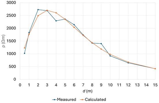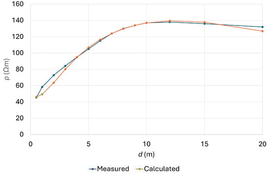 Based on Table 6, it can be seen that B for the four-layer model (6.1561) is better than B for the three-layer model (6.2156), and M for the four-layer model is lower (7.7921) than M for the three-layer model (9.5019). We decided to use the parameters of the best solution for the four-layer model, denoted in Table 6. The measured and calculated apparent resistivities used for the FEM model are presented in Figure 6.