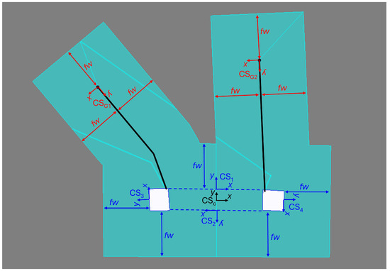 The geometry coordinates of test poles TP1 and TP2 were obtained in GPS coordinates. Several local coordinate systems were used for modeling. It is important for changing the width of the protective film (fw) to be as easy as possible, because their optimal dimensions are the subject of this research. The coordinate systems (CSs) used are shown in Figure 9, which were as follows: