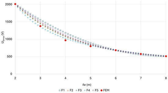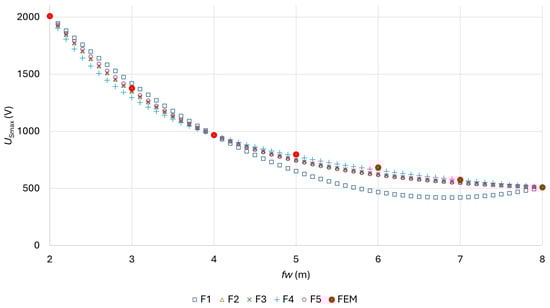 A nonlinear function was written successfully, which describes the dependence of the maximum step voltage well for each foil width. Among the compared functions, F1 to F5, which determine the dependence of the maximum step voltage on the width of the protective foil, function F4 was the most appropriate. The criterion for selecting the most appropriate function was the fitness error, determined based on the OF7 criterion written in (26). Although we used DE/rand/1/exp to determine the parameters, it is clear from the results of the evolutionary method comparison that DE/rand/2/exp, DE/best/1/bin, ABC, and TLBO would also be suitable.