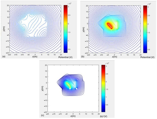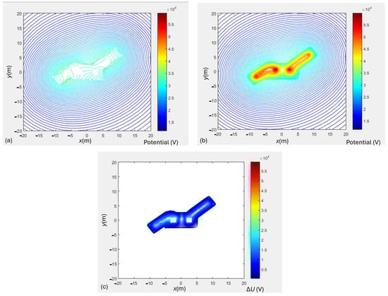 TP2, fw = 2 m: (a) potential above the protective foil, (b) potential below the protective foil, (c) potential difference.