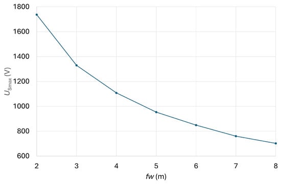 The basis for the presentation of the proposed method for optimal foil width determination is the data from the first transmission pole (TP1), i.e., the data from soil measurements using the Wenner method [,,,,] and the geometry of the grounding system in the vicinity of the pole. Based on the measurements using the Wenner method, we determined the soil data needed for the FEM models using an analytical soil model and the ABC evolutionary method. ABC was used based on our experience from previous research []. The FEM was conducted to determine the function of Us = F(fw).