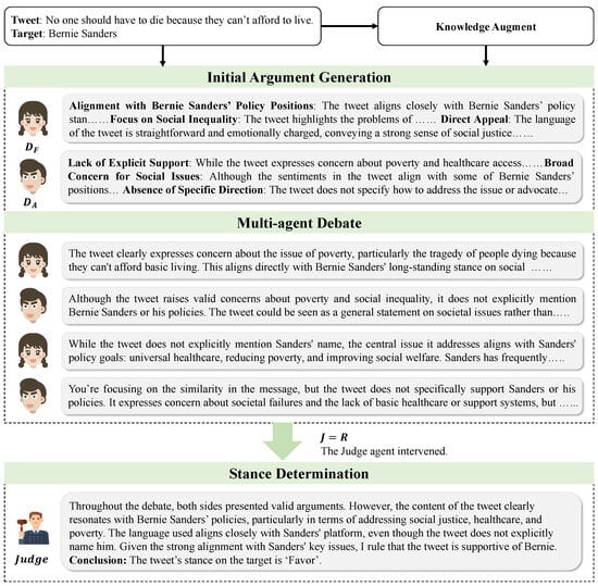Multi-agent debate (MAD) is fundamentally an interactive reasoning and decision-making framework in which multiple agents assume distinct roles and engage in “debate” or “collaboration” to guide the model toward eliminating errors and arriving at more robust conclusions. Initially, this approach was predominantly applied in game theory and automated dialogue systems. However, in the context of large language models, researchers have discovered that leveraging mutual questioning, inquiry, and response among multiple agents can effectively mitigate hallucination phenomena while enhancing the diversity and interpretability of reasoning [24,25,26]. In recent years, MAD has increasingly been incorporated into various natural language processing tasks. Park et al. [27] proposed a framework that employs multi-agent debate for hate speech detection. Wang et al. [28] introduced a Multi-Agent Debate with Knowledge-Enhanced framework (MADKE) to address the issue of cognitive islands among individual agents. Du et al. [29] suggested a method where multiple agents independently analyze and propose solutions for a given task, engaging in critical debate and scrutiny of each other’s proposals to enhance the model’s factual accuracy and reasoning capabilities. Similarly, Smit et al. [30] utilized a multi-agent debate approach to improve performance in medical question answering. While these methods demonstrate the growing versatility of multi-agent debate in various NLP tasks, to the best of our knowledge, no prior work has explicitly applied a multi-agent debate framework to zero-shot stance detection. Our work is the first to explore this integration, combining MAD with knowledge enhancement for interpretable stance reasoning in zero-shot scenarios.