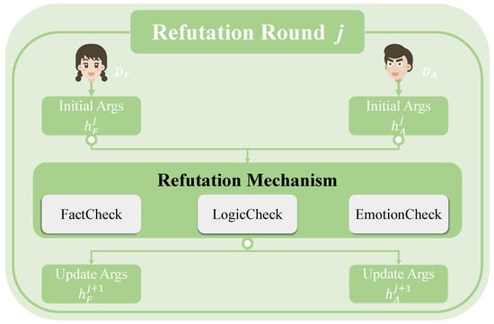 Refutation mechanism in multi-agent debate framework. This diagram illustrates how, in each debate round j, the two agents exchange and update their arguments via three refutation strategies—FactCheck (Equation (4)), LogicCheck (Equation (5)), and EmotionCheck (Equation (6))—and terminate the debate either upon reaching consensus or upon completing the maximum number of rounds.