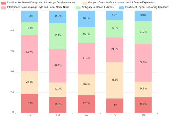 Based on the experimental results, we conducted a detailed error analysis of the ZSMD framework. Figure 4 summarizes the distribution of classification errors made by DeepSeek-v3 on the SemEval-2016 Task 6 dataset, categorized by underlying causes. We categorized the primary sources of errors into five types, as follows: