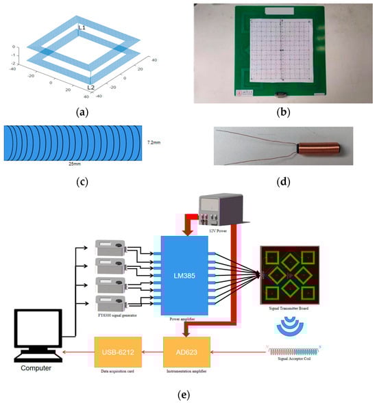 Electromagnetic transmitter board: (a) schematic diagram of the electromagnetic transmitter board; (b) electromagnetic field transmitter board; (c) schematic diagram of the sensor coil; (d) sensor; (e) system architecture; (f) photographed image of electromagnetic tracking.