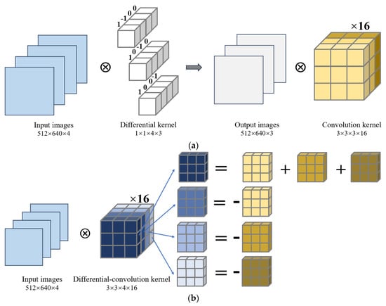 Using sequential-differential acceleration to merge the improved differential layer and adjacent convolutional layer: (a) original differential and convolution operation; (b) combined operation using sequential-differential acceleration.