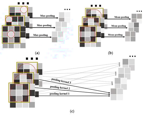 Comparison of the three pooling methods: (a) max-pooling; (b) mean-pooling; (c) conv-pooling.