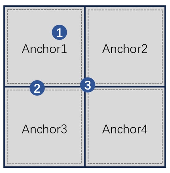 To reduce the missed detections of the network, this article adopts a multi-anchor box assignment strategy. A buffer area is set, as shown in the dashed area in Figure 7. When the target is located in the buffer area, it is considered to belong to both anchor boxes, and the target labels are assigned to the anchor boxes. As shown in Figure 7, Target 1 is inside the anchor frame (Anchor1) that performs the target detection; Target 2 is in the middle of two adjacent anchor frames (Anchor1 and Anchor3), and both anchor frames are assigned target labels and perform the target detection together; and Target 3 is in the middle of four anchor frames (Anchor1, Anchor2, Anchor3, and Anchor4), which are assigned target labels and also perform the target detection together. The multi-anchor box assignment strategy allocates multiple anchor boxes to detect the boundary targets, which increases the target detection probability and improves the continuity of moving target detection.