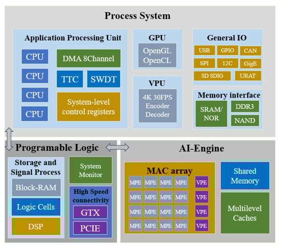 The heterogeneous FPGA JFMQL100TAI chip of the Fudan Micro Company integrates a processing system (PS), programmable logic (PL), and Buyi AI acceleration engine based on a four-core processor with rich characteristics. The schematic diagram of each unit is shown in Figure 13. The PS is a four-core high-performance 64-bit energy-efficient Cortex-A53 processor based on ARM v8 instruction set architecture, which can be used as the main task management processor of the system, including SDIO, QSPI, UART, Ethernet, and other interfaces. The abundant programmable resources and high-speed interface resources at the PL can also complete the main interface logic functions, including the main control board GTX high-speed communication interface, LVDS interface, PCIE2.0, HDMI, and other high-speed and low-speed interfaces from the backplane; its rich programmable logic resources greatly improve the flexibility and scalability of the system. The Buyi AI acceleration engine is an ASIC AI processing engine integrated into the chip, which supports a variety of quantization precision tasks and has a strong AI computing capability. The quantization computing power for int8 reaches 27.52 TOPs, and for int16, it reaches 6.88 TOPs.