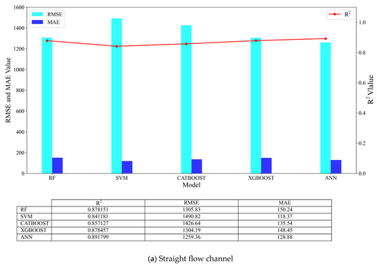 Modeling results of two flow channel working conditions with different models (The segmentation ratio was 7:3, and R2, RMSE, and MAE were used as evaluation indicators to evaluate all traditional machine learning models).