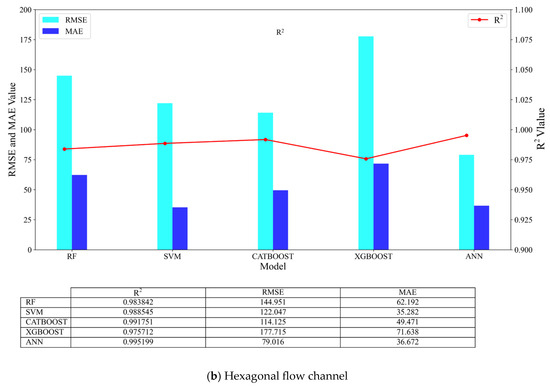 Figure 4b shows the performance of different models in the modeling of hexagonal channels. By comparing the RMSE, MAE, and R2 indicators, the following conclusions can be drawn: In the modeling of hexagonal channels, the XGBOOST model has the highest RMSE value, 177.715, indicating a relatively large prediction error. In contrast, the ANN model has the lowest RMSE value, 79.016, demonstrating the best prediction accuracy. In the modeling of hexagonal channels, the ANN model has the highest R2 value, 0.995199, indicating the best fit to the data. Relatively speaking, the XGBOOST model has the lowest R2 value, 0.975712, showing a relatively poor fitting effect. Considering both error and fitting degree comprehensively, the ANN model performs best in the modeling of hexagonal channels, followed by the CATBOOST model, which has an R2 value of 0.991751 and an RMSE of 114.145, demonstrating a relatively good balance of performance.