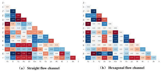 Pearson correlation coefficient heat map: (a) straight flow channel; (b) hexagonal flow channel.