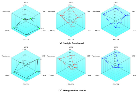 After the grid search, the modeling results of six deep learning models are shown in Figure 6. The first column represents R2, the second column represents RMSE, and the third column represents MAE. The first row is for the straight channel, and the second row is for the hexagonal channel. For the straight channel, LSTM shows the highest prediction accuracy, with an R2 of 0.89317, RMSE of 1219.79, and MAE of 118.88. Next are the BiGRU and BiLSTM models, both with R2 values exceeding 0.8923, and their fitting effects are also good. In the prediction results of the hexagonal channel, the fitting effect of LSTM is still relatively good, but the BiGRU and BiLSTM models maintain the highest accuracy results, with R2 values of 0.99844 and 0.99835, respectively. The Transformer and CNN models perform relatively poorly, which may be due to certain limitations in handling complex spatial relationships and sequence features. To improve the performance of these models, it may be necessary to introduce an attention mechanism to enhance the models’ ability to capture key features and thereby improve prediction accuracy.