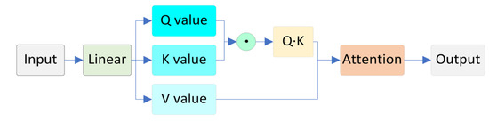 Self-attention (SA) is utilized to capture the dependencies among elements within a sequence [31]. Its core concept involves calculating the correlation weights between each element and all other elements in the sequence and dynamically assigning attention weights to each element, thereby integrating global information. The schematic diagram of SA is presented in Figure 7.
