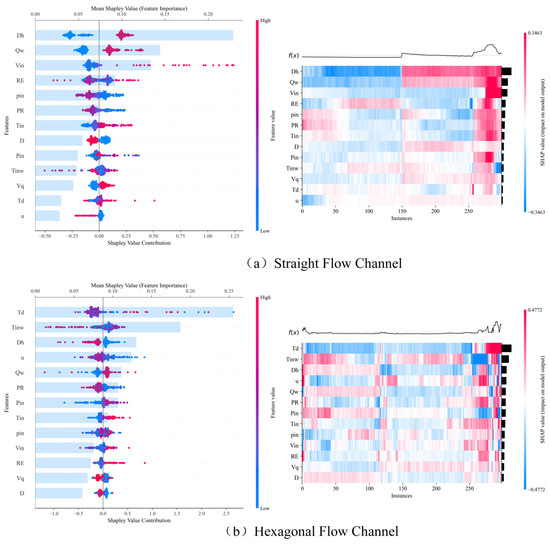 Global interpretation analysis was performed on the Transformer–SE model in the straight channel (R2 = 0.914) and the Transformer–LA model in the hexagonal channel (R2 = 0.999). SHAP statistics plots and heatmaps were generated for all features, as presented in Figure 10. The analysis of the two channel shapes—namely, the straight channel (Figure 10a) and the hexagonal channel (Figure 10b)—revealed substantial differences in feature importance and their contributions to the model output.
