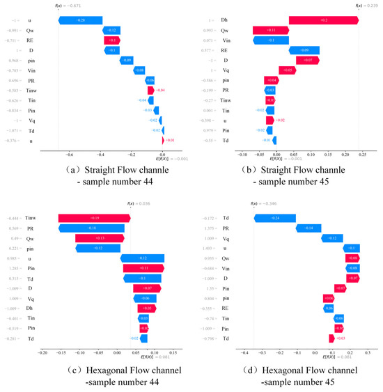 The SHAP local interpreter was employed to perform local interpretation on four samples, including continuous samples from two types of flow channels. The SHAP waterfall plots are presented in Figure 11. It can be observed that there are substantial differences in feature importance between the straight channel and the hexagonal channel within a single sample. In the two samples of the straight channel, the features RE and Dh exhibit the greatest impact on the model output, whereas in the hexagonal channel, the features u and Tinw demonstrate a more significant influence. Additionally, even within the same type of flow channel, feature importance varies across different samples. For instance, in the straight channel, features RE and Dh have a greater impact on sample 75, while their influence is relatively smaller on sample 76, with an increased contribution from feature Tinw. Moreover, the direction of feature contributions to the model output also differs across the different flow channels and samples. For example, feature RE predominantly contributes negatively in the straight channel but positively in the hexagonal channel.